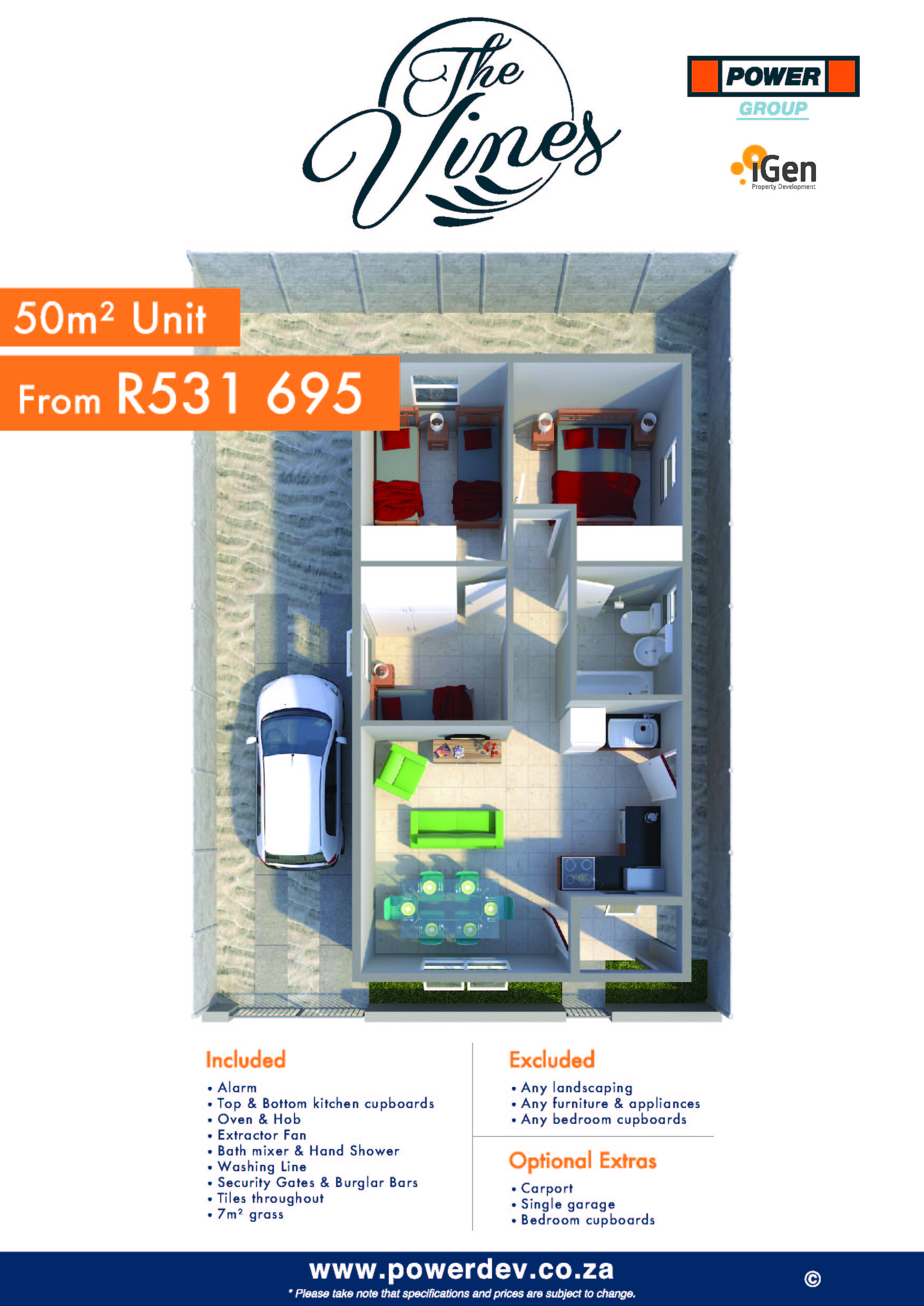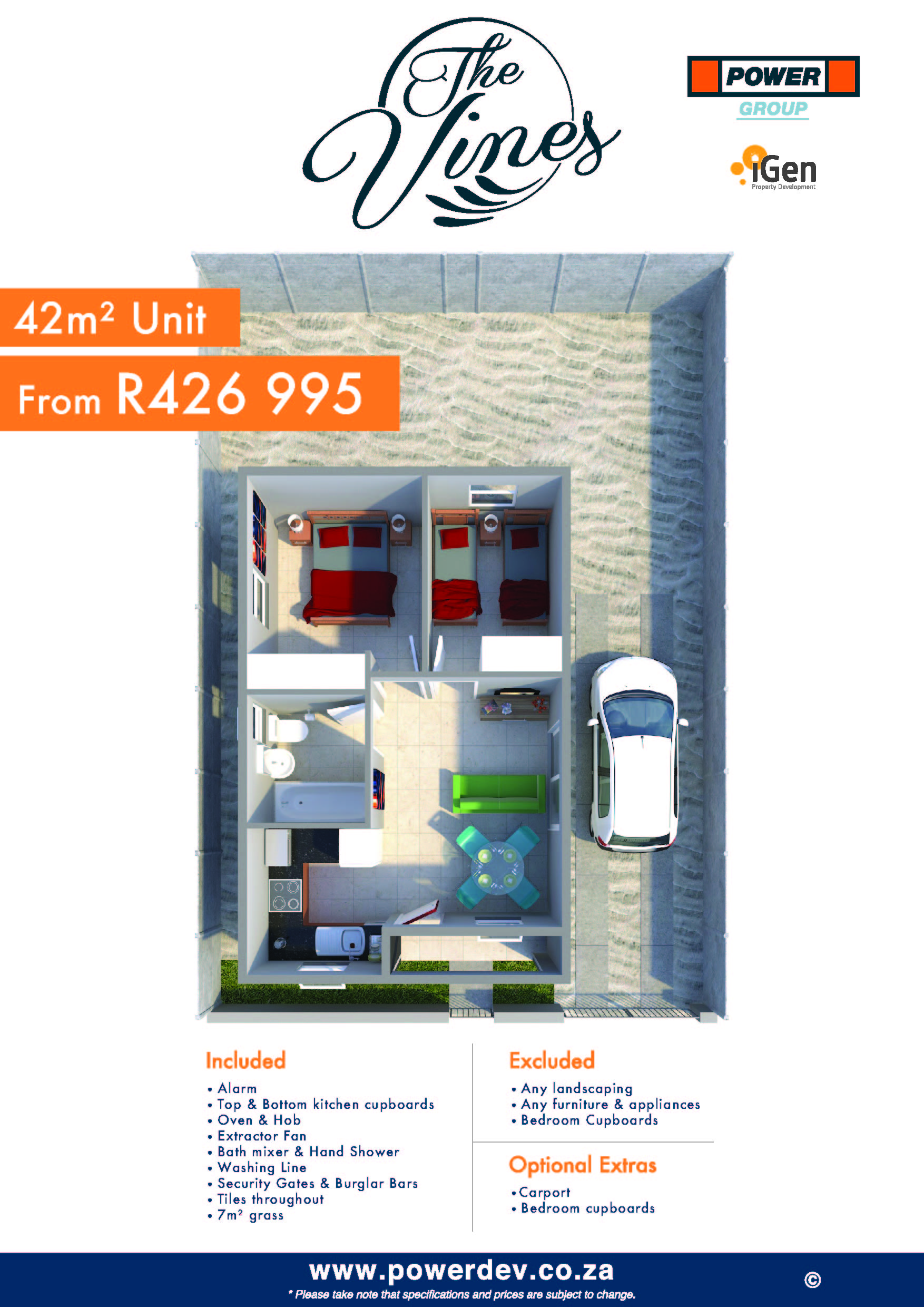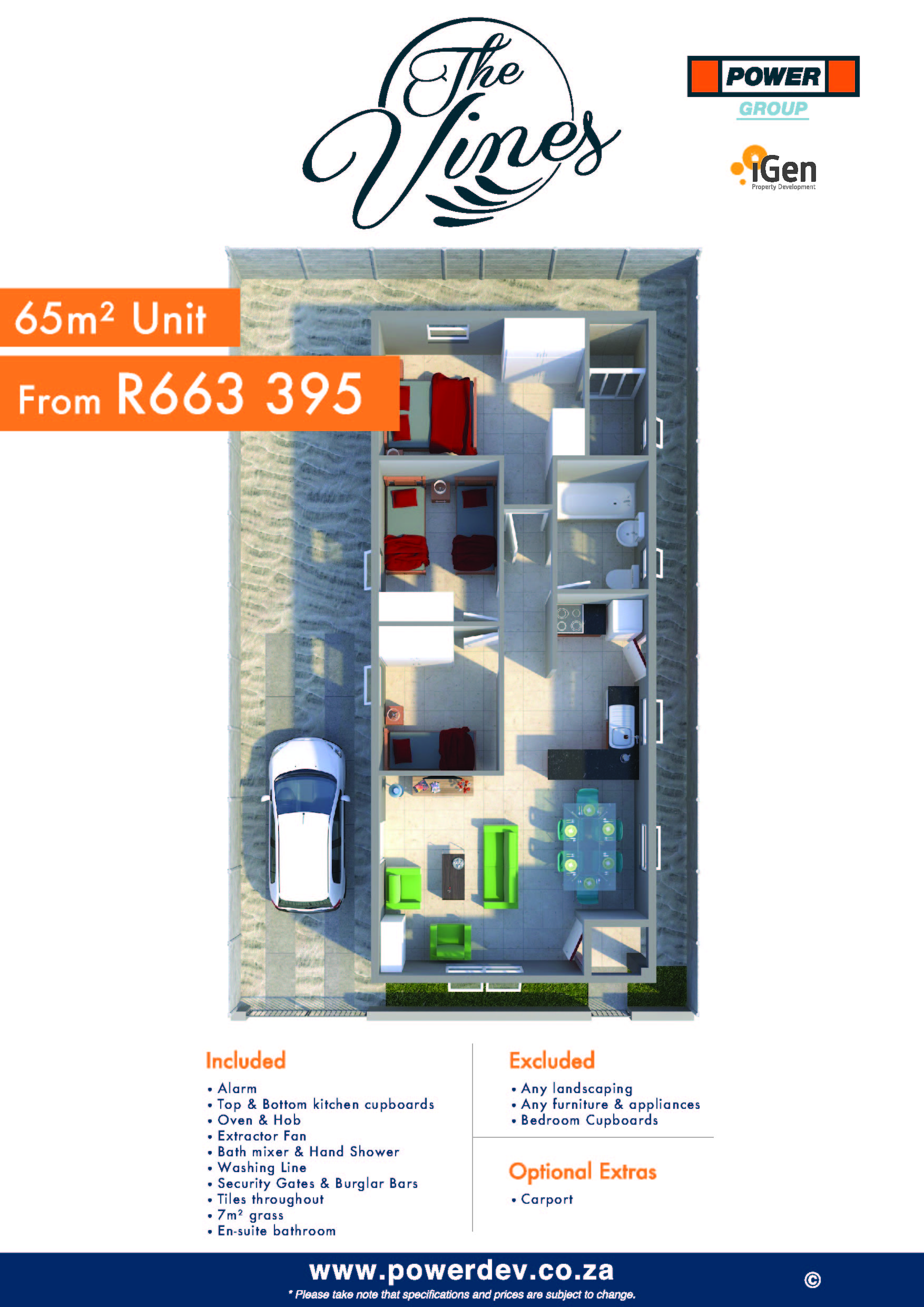 The Vines consisting of 83 free standing homes includes a selection of different house typologies, ranging in size from 42-65m² with 2 or 3 bedrooms to choose from. Your home comes with optional extra’s including garages, carports and various finishes. You can select the house to suit your needs and budget. Just bring your pots and pans…your new home comes standard with a well-designed kitchen including an oven and hob, burglar bars, security gates, alarms, washing line and is already walled for additional safety and security.