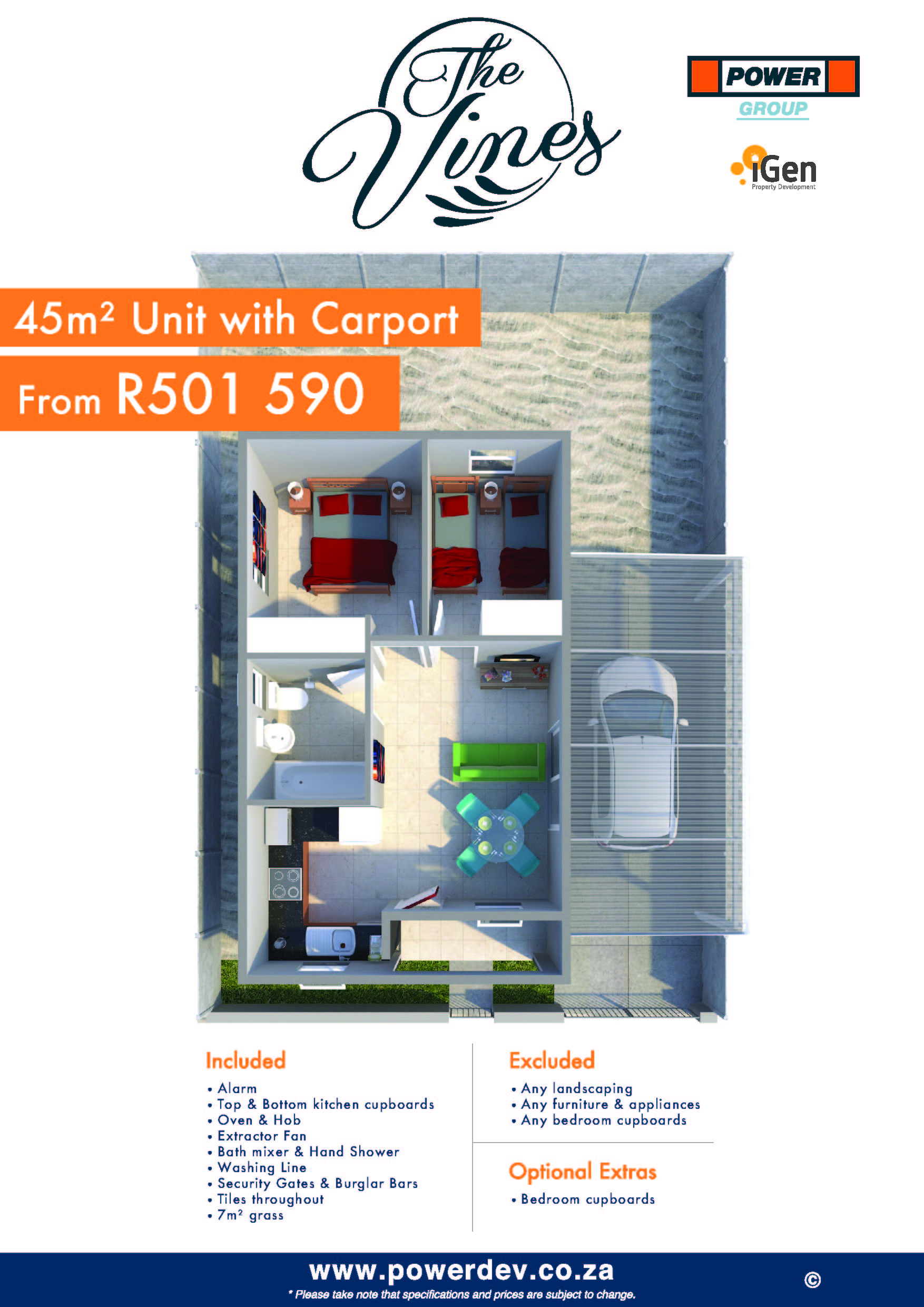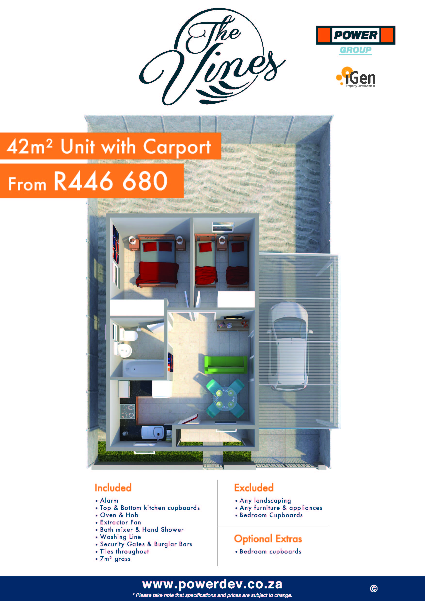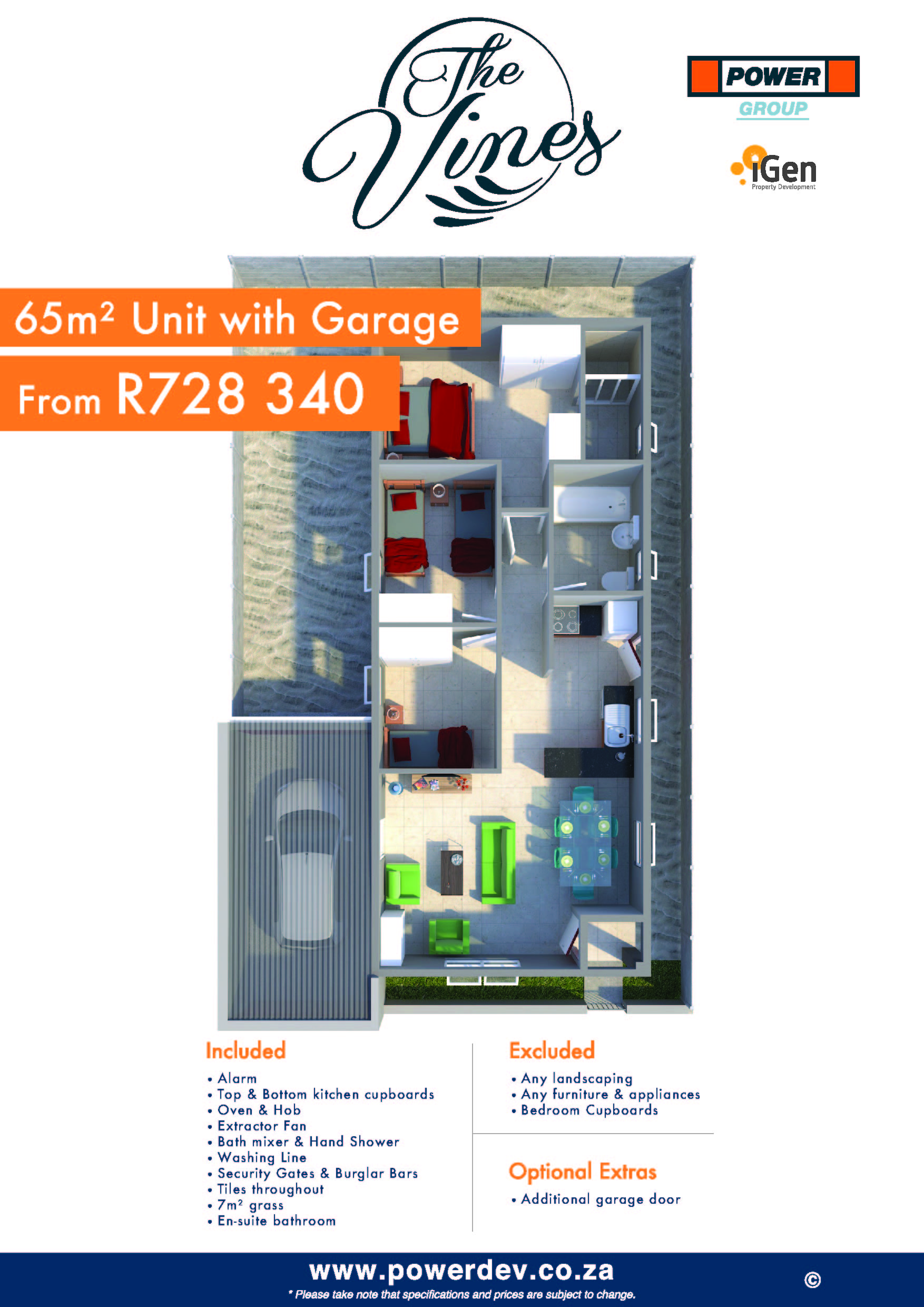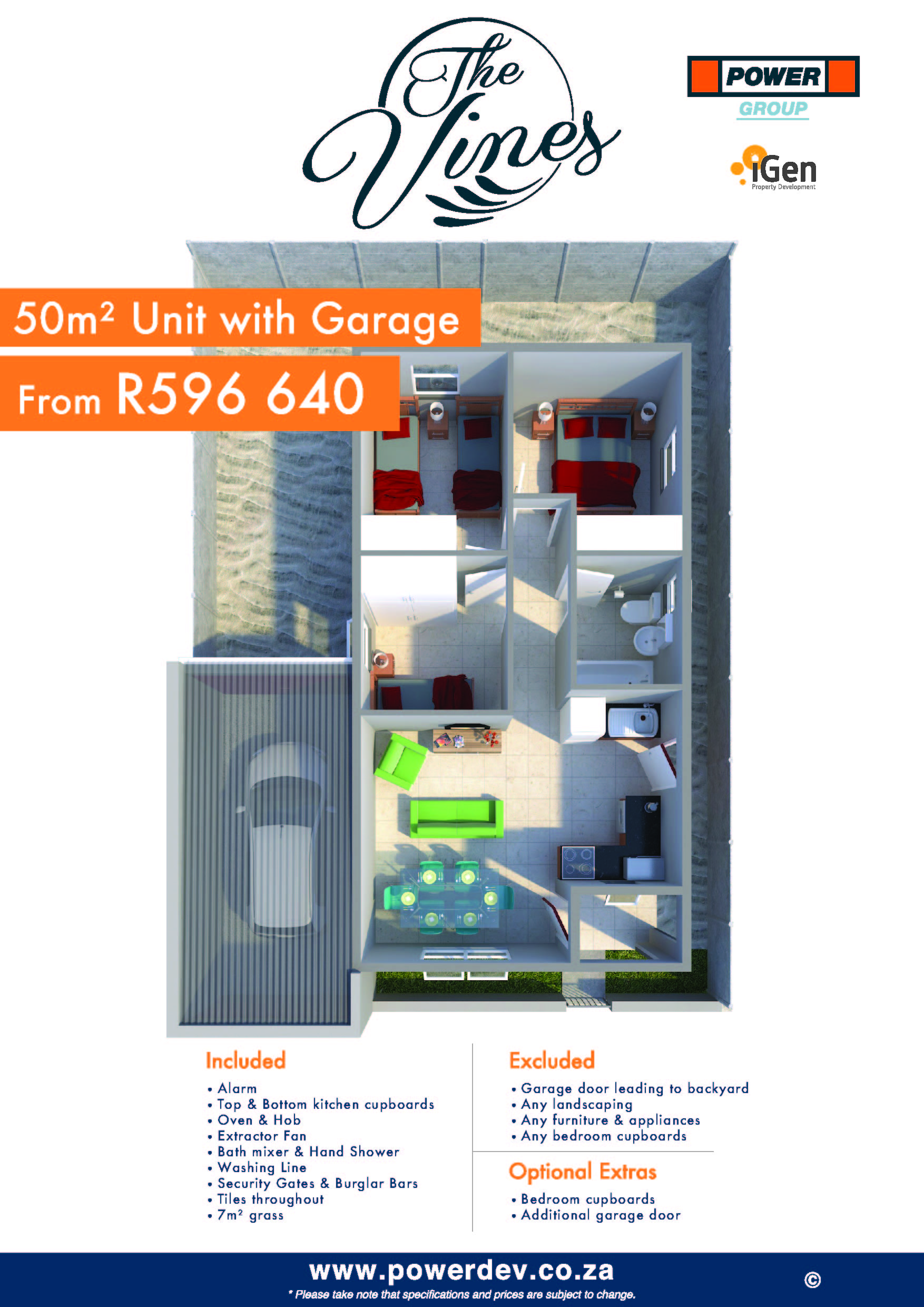 The Vines consisting of 83 free standing homes includes a selection of different house typologies, ranging in size from 42-65m² with 2 or 3 bedrooms to choose from. Your home comes with optional extra’s including garages, carports and various finishes. You can select the house to suit your needs and budget. Just bring your pots and pans…your new home comes standard with a well-designed kitchen including an oven and hob, burglar bars, security gates, alarms, washing line and is already walled for additional safety and security.